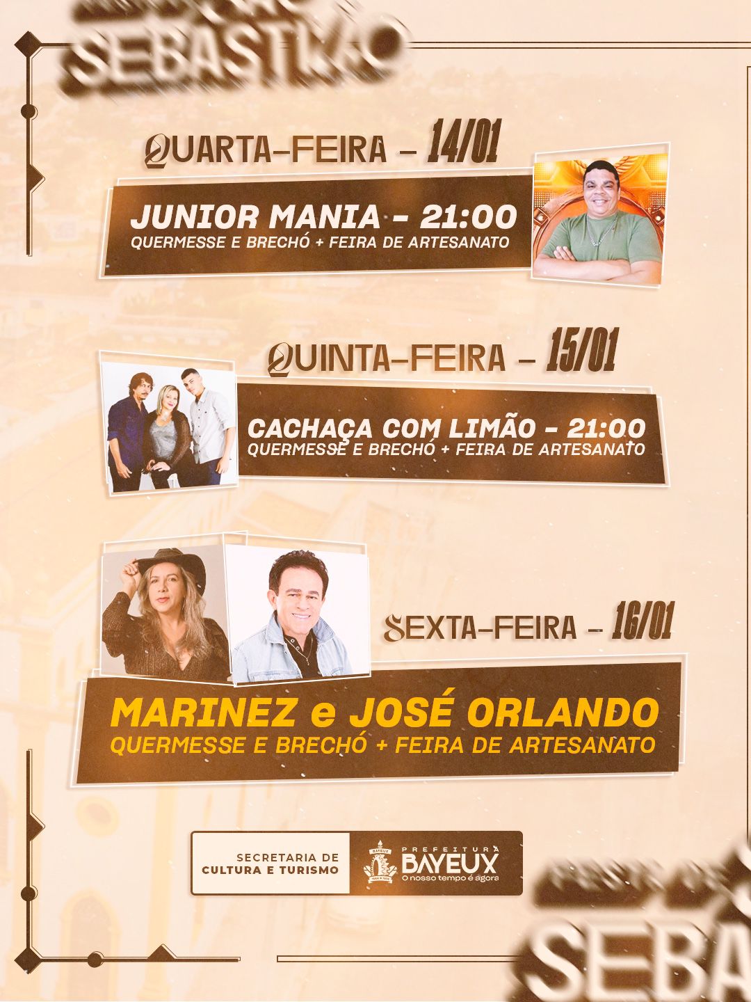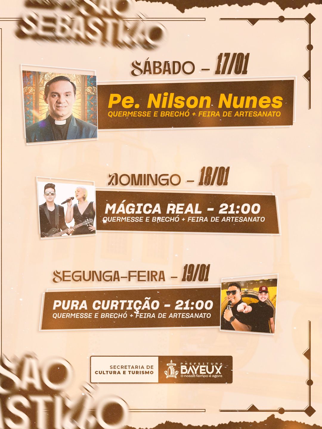 Organizada pela Prefeitura de Bayeux, através da Secretária de Cultura, o evento terá shows do Padre Nilson, José Orlando e muito mais. Além disso, a gestão municipal programou uma corrida, feira de artesanato, quermesse e brechó. A festa começa sempre a partir das 19h ao lado da Igreja São Sebastião e no anexo do templo religioso. Veja a programação abaixo.